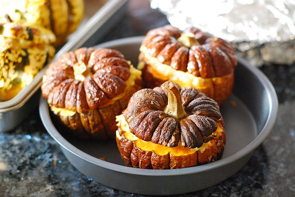 Слегка сбрызгиваем сверху оливковым маслом и отправляем в разогретую до 180 градусов духовку, минут на 30-40. За 5 минут до готовности посыпать тертым пармезаном. Вынуть фаршированную тыкву из духовки, накрыть крышкой и подать к столу.