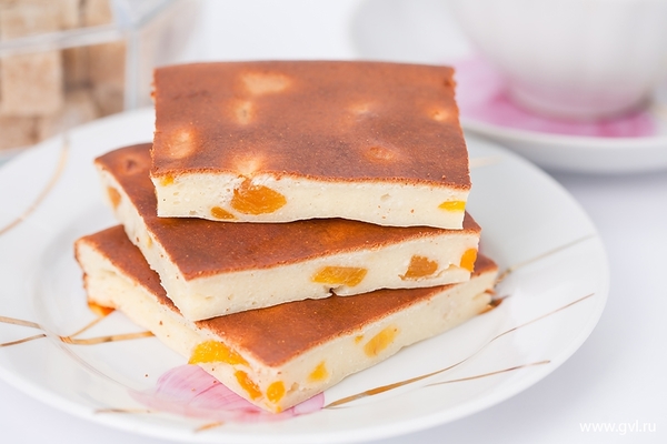 Курагу залить горячей водой на полчаса, воду слить. Курагу нарезать кусочками и добавить к творожной массе. Форму застелить бумагой для выпечки, равномерно распределить тесто и запекать около 40 минут в предварительно разогретой до 200-220 градусов духовке.