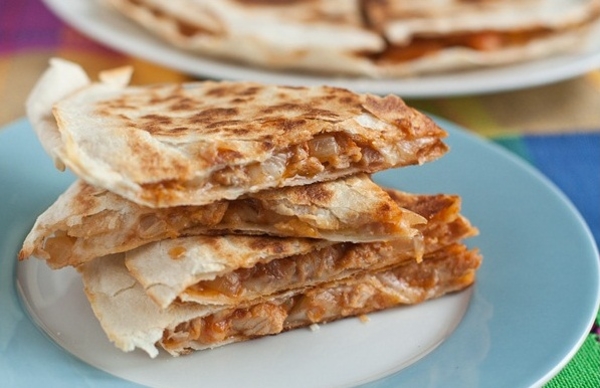 На сыр выложить слой начинки, сверху еще слой сыра. Затем накрыть второй тортильей. Готовить в 1-2 минуты, затем аккуратно перевернуть и поджарить с другой стороны. Таким же образом поджарить оставшиеся тортильи. Нарезать кесадилью на сектора и подавать горячей.