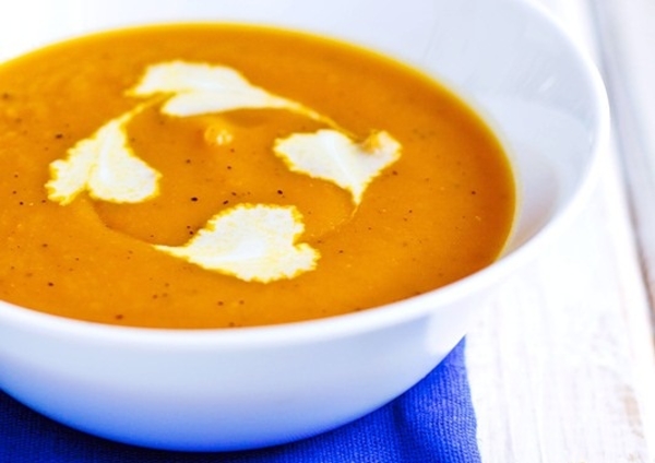 Тыкву, морковь и лук-порей нарезать, полить оливковым маслом, запечь в духовке при 200 градусах до мягкости овощей.