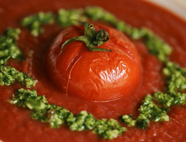 Перелить в кастрюлю, добавить томатный сок. Медленно помешивая, довести до кипения. Добавить соль и перец по вкусу, готовить еще пять минут. Разлить суп по тарелкам, в центр поместить печеный помидор. Украсить соусом песто и листиками тимьяна.