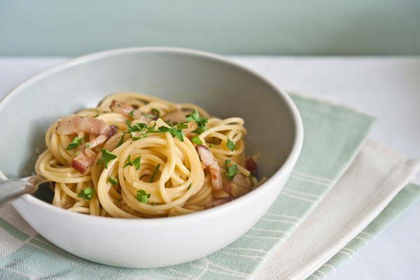 Что нужно: 1 упаковка спагетти, 4 яйца, 200 г бекона, 50 г тертого пармезана, 4 дольки чеснока, 1 луковица, 1 чашка белого вина, 1 стакан куриного бульона, горсть порезанной петрушки, оливковое масло по вкусу, соль, перец черный по вкусу