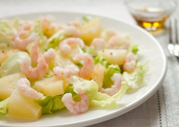 Обычно салаты из креветок готовят с авокадо - это сочетание давно стало классическим. Тем не менее, можно попробовать еще один, более интересный вариант - приготовить салат из креветок с ананасами