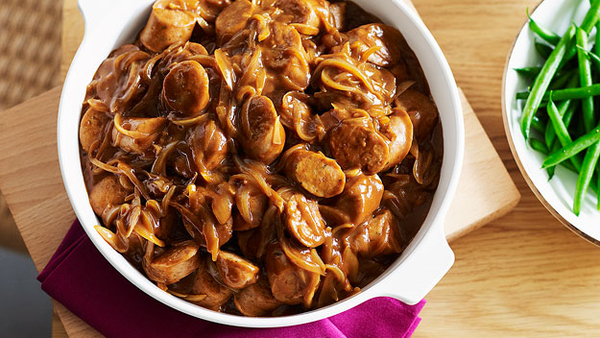 Накрыть сковороду с крышкой и готовить 20 минут на среднем огне. Можно переложить колбаски с луком в подходящую посуду и запекать в духовке до готовности. Приправить солью и перцем по вкусу. Подавать колбаски горячими с картофельным пюре.