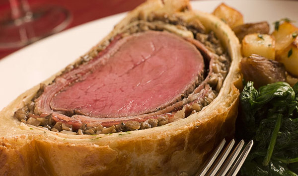 Филе говядины обмыть, промокнуть, обсушить и снять пленку. Одну столовую ложку сливочного масла растопить, быстро обжарить мясо со всех сторон, приправить солью и перцем, снять со сковороды и дать остыть. Сало от ветчины и репчатый лук нарезать кубиками, сало добавить в жир, в котором жарилось мясо, нагреть, добавить лук, тушить до прозрачности.