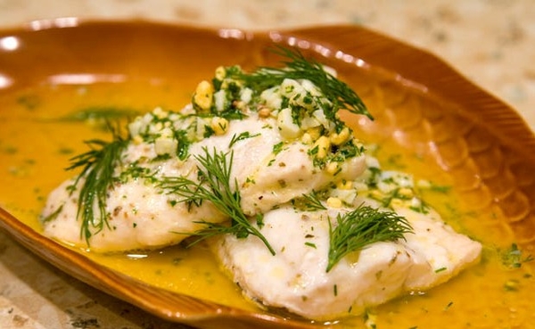 Готовую рыбу переложить на тарелки, полить соусом и украсить зеленью укропа. Гарнир необязателен, а вот хорошее вино и свежий белый хлеб – весьма желательны.