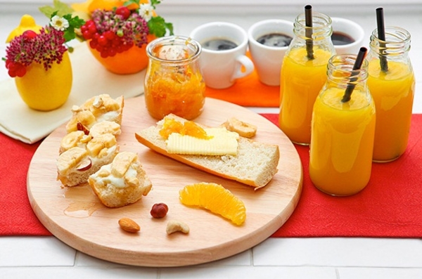 Особое утреннее настроение зададут бодрящий апельсиновый фреш и чашечка натурального кофе. А неповторимую уютную атмосферу подарят букетики в ярких мини-вазочках, сделанных из апельсиновой и лимонной цедры.