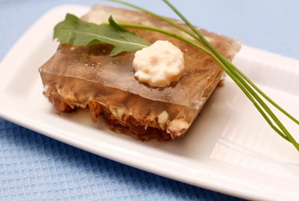 Когда в России началась повальная мода на французскую кухню и из Парижа стали выписывать поваров, хитрые французы сразу взяли студеный принцип на заметку. Но заливать бульоном они стали аккуратные мясные, рыбные и куриные кусочки.