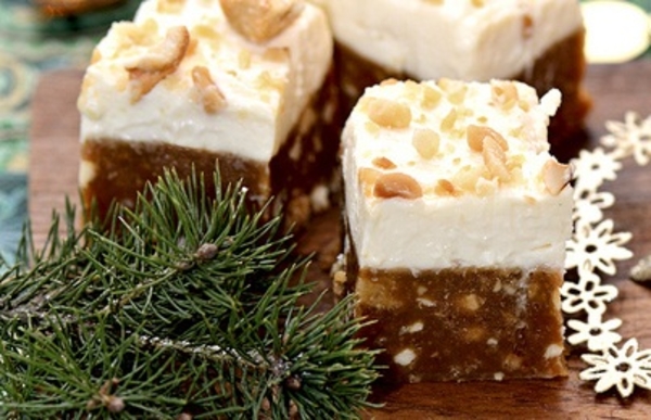 Для крема: Взбиваем сливочный сыр, добавляем сахарную пудру и алкоголь. Взбиваем еще раз до получения пышной массы. Покрываем нугу кремом, посыпаем орехами. Отправляем на ночь в холодильник.