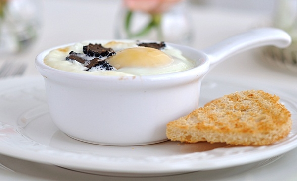 Сверху разбить два яйца, белки полить сливками, посолить и поперчить. Отправить яичницу в разогретую до 180 градусов духовку на 20 минут.