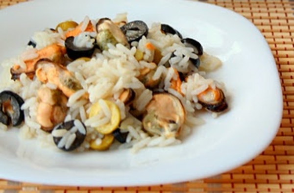 Зимний рисовый салат с мидиями и маслинами
