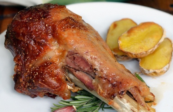 Переворачиваем на другую сторону. Смазываем сливками, подрумяниваем. Затем кладем в утятницу розмарин, закрываем крышкой, убавляем огонь до 180 градусов и готовим еще около часа.