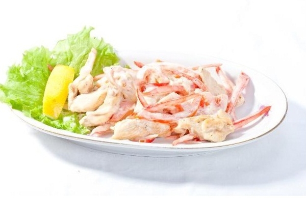 Салат из курицы с овощами и мясом краба