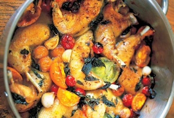 Наколоть помидоры острым ножом, обдать кипятком и снять кожицу. Растереть в ступке большую часть листьев орегано со щепоткой соли. Влить 4 ст. л. оливкового масла, плеснуть уксуса, добавить немного перца. Добавить смесь к курице с картофелем, помидорами и оставшимся орегано. Запекать в духовке около 40 минут.