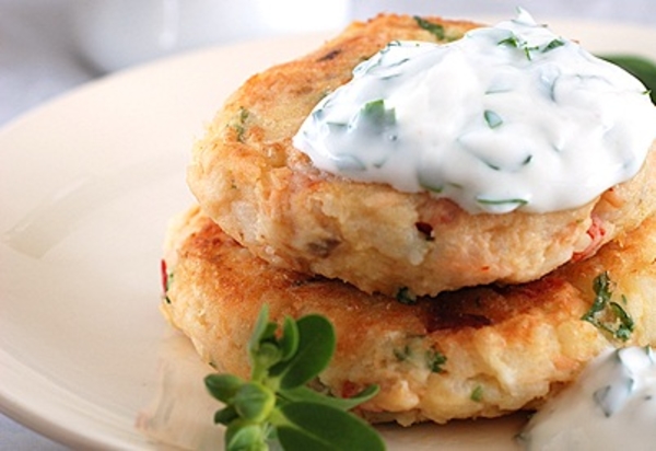 Сформировать 4 больших или 8 маленьких котлет. Обвалять в муке и обжарить на разогретой сковороде на смеси сливочного и оливкового масла до золотистой корочки. Подавать с овощным салатом и соусом из йогурта.