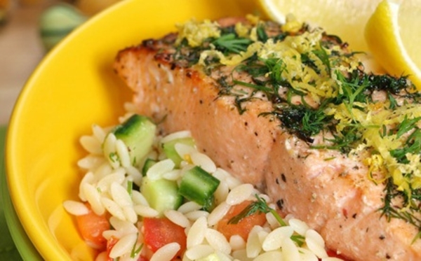 Отварить рисини по инструкции на упаковке. Готовую пасту промыть под струей холодной воды, буквально несколько секунд, чтобы не остыли. Смешать рисини с овощами и укропом, заправить оливковым маслом и лимонным соком. Добавить по вкусу соль и перец. Подавать с лососем.