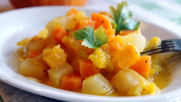 На дно кастрюли положить порезанную кубиками морковь, сверху на нее капусту, а затем на капусту – картошку. Если ты используешь тыкву, ее нужно положить на самый верх.