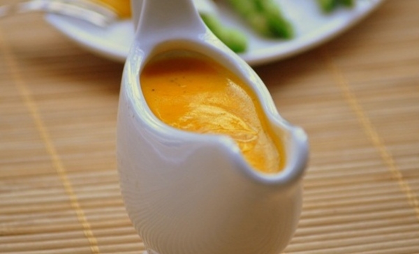 Поставить на водяную баню, добавить сливочное масло и дать ему растаять. Ввести слегка взбитые желтки, постоянно помешивая. Довести соус до загустения, снять с огня и дать остыть.