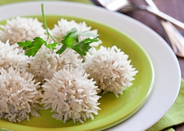 Положить подготовленный рис на тарелку. Мокрыми руками сформировать шарики из куриного фарша и обвалять их в рисе. Рис должен покрывать фарш со всех сторон равномерно.