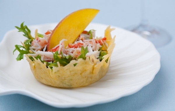 Смешать манговое пюре с оливковым маслом и солью. Заправить соусом салатные листья. Выложить в сырную корзиночку заправленные листья Фризе и кусочки камчатского краба.