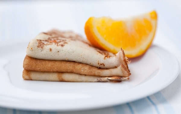 Готовое тесто поставить в теплое место на 10-15 минут. Затем хорошенько разогреть сковороду и жарить блины. Полить теплые блинчики лимонным соком, посыпать сахаром и завернуть уголком. Перед подачей украсить каждую порцию ломтиком апельсина.