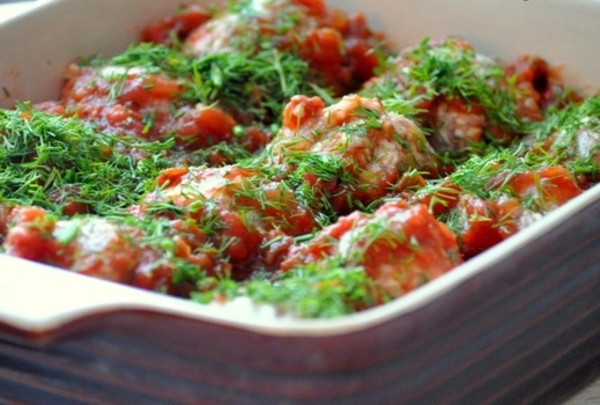 Сформировать маленькие котлетки, уложить в форму для запекания. Залить соусом из помидоров , посыпать резаной зеленью, накрыть форму фольгой и поставить в духовой шкаф.