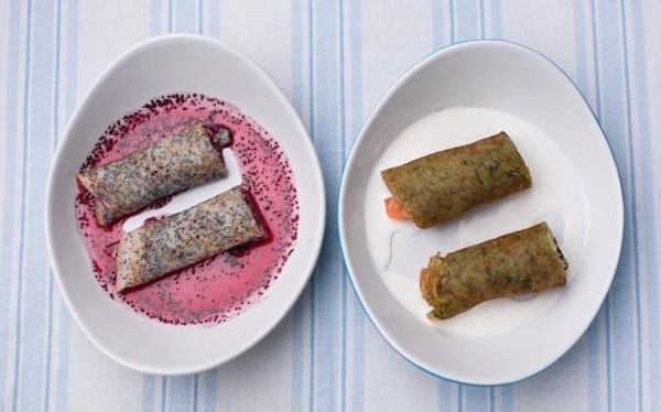 В блины со шпинатом Даша предлагает завернуть ломтики слабосоленого лосося. Для этого просто нужно нарезать лосося тонкими полосками и завернуть в блин.