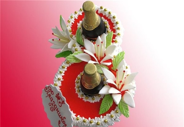 Каждый корж разрезать пополам горизонтально и смазать кремом, затем накрыть вторым коржом. Соединить оба торта так, чтобы получилась цифра 8.