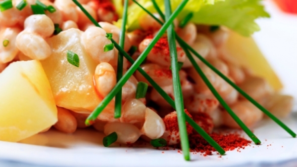 Овощи отварить в подсоленной воде. Крупно и произвольно нарезать овощи и соединить их с фасолью и рубленой зеленью.