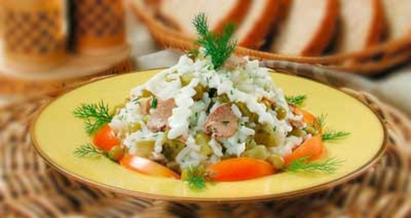Рецепт праздничного салата на 8 марта из трески, риса, зеленого горошка и яиц