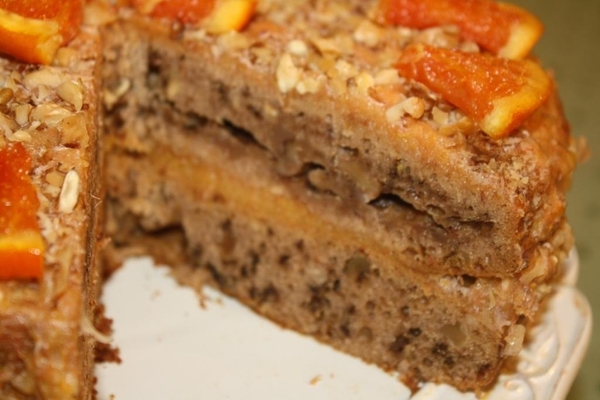 Готовый корж разрезать горизонтально на 2-3 пласта, и промазать начинкой. Верх торта с бананом можно украсить орехами. Постный торт готов!
