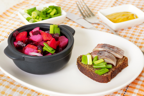 Готовим постный овощной винегрет с квашеной капустой, филе сельди и зеленью укропа