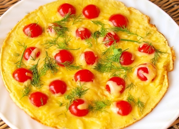 Яркий омлет с зеленью и помидорами черри поможет настроиться утром на легкий весенний лад