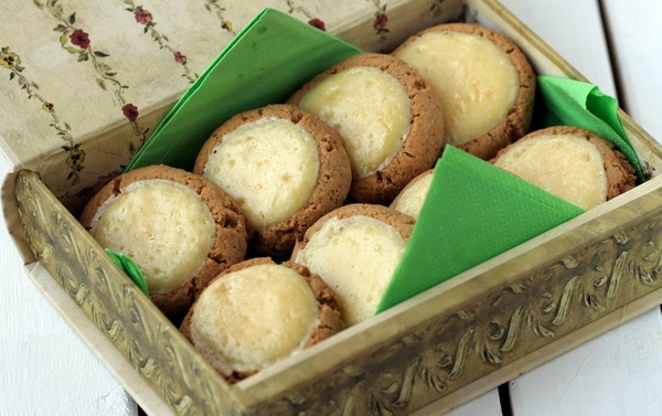 Теперь набираем 1 ст. л. с небольшим верхом теста и формируем руками шарик, укладываем на противень.То же самое проделываем с остальным тестом. Теперь тыльной стороной ложки делаем углубления в шариках для наполнителя (принцип ватрушки). Заполняем начинкой.