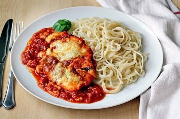 Выкладываем курицу в форму и заливаем соусом. Затем покрываем все слоем сыра, отправляем в духовку разогретую до 200 С. Готовим 20-25 минут.