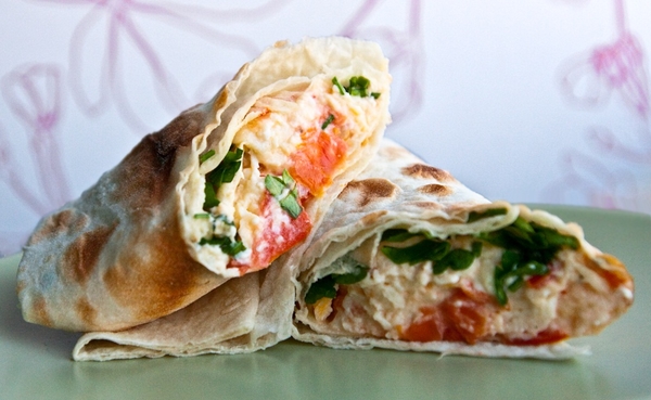 Быстрый и вкусный завтрак: роллы из тонкого армянского лаваша с яичницей-болтуньей, фетой и свежими томатами