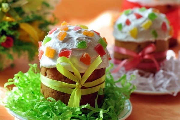 Для глазури белки взбить вместе с сахарной пудрой, добавив несколько капель лимонного сока. Покрыть глазурью готовые куличи, украсить их цукатами.