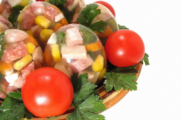 Ингредиенты: 7 яиц, 100 г куриного филе, 75 г ветчины, 2 ст.л. желатина, 100 мл воды, консервированный зеленый горошек, консервированная кукуруза, зеленый салат, петрушка, соль