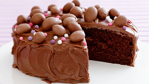 4. Кусочки молочного шоколада и сливки отправить в кастрюльку, поставить на слабый огонь и нагревать, пока шоколад не расплавится. Венчиком размешать смесь, чтобы получилась блестящая однородная масса. Слегка остудить и покрыть глазурью торт. Когда шоколад застынет, украсить торт маленькими шоколадными яйцами и кондитерской посыпкой.