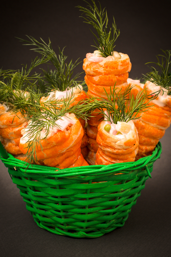 Пасха в 2015 году наступит 12 апреля. Предлагаем тебе забавную идею для детского пасхального стола – морковки из слоеного теста, наполненные яичным салатом и украшенные свежей зеленью.