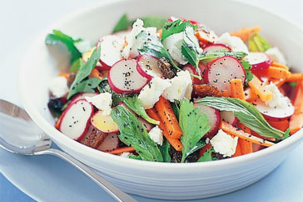 Положить редис, морковь, семена мака и заправку в миску и хорошо перемешать. Добавить петрушку и листья мяты. Осторожно перемешать, переложить в большую салатницу. Посыпать салат изюмом и козьим сыром, приправить свежемолотым перцем. Подавать салат как легкую закуску или как гарнир к креветкам, баранине или говядине.