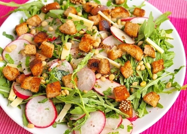 Готовый салат посыпать поджаренными гренками и кедровыми орешками.