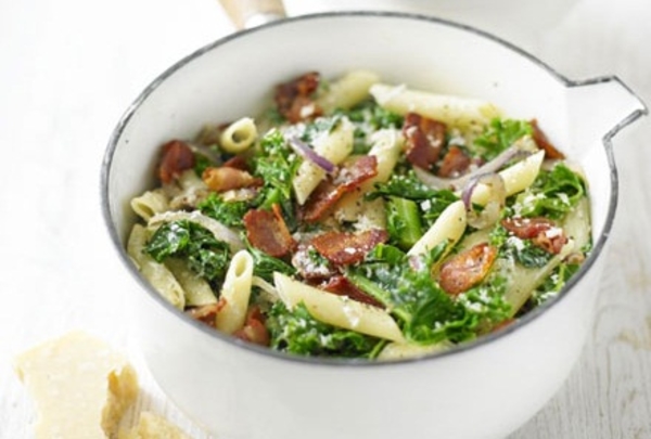 В сковороду отправить пасту, листовую капусту, бекон и козий сыр. Если смесь покажется сухой, влить немного жидкости, в которой варились макароны.