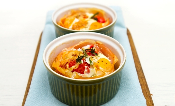 На дно формочек выложить по ломтику ветчины и по несколько помидоров черри. Добавить в каждую формочку по два яйца. Приправить яйца черным перцем, солью, пармезаном и выпекать до желаемой готовности при температуре 160 С.