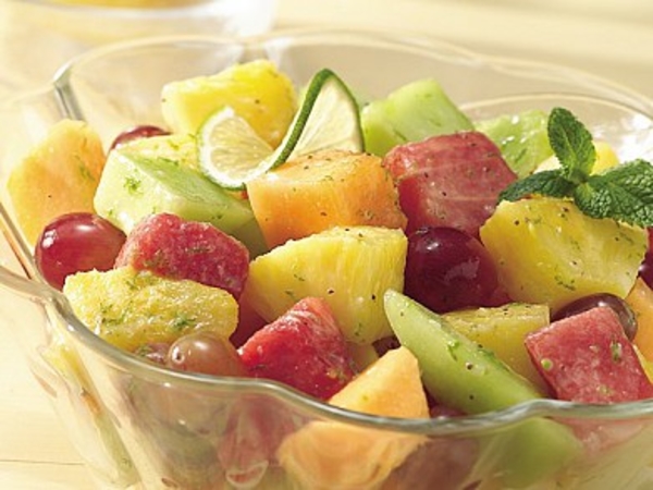 В небольшой миске смешать ананасовый сок, мед, сок половины лайма, тертую цедру. Сбрызнуть полученной смесью фрукты и подавать.