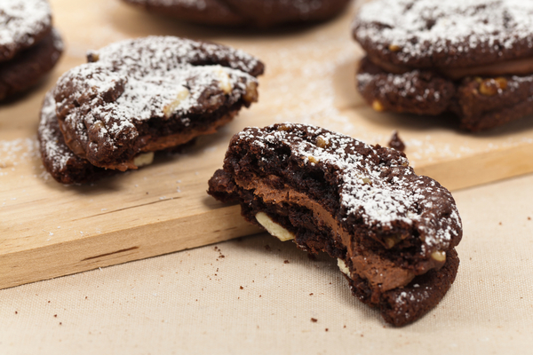 Собрать сэндвичи — чайной ложкой выложить крем на нижнюю часть печенья, накрыв сверху другой частью. Это печенье можно хранить в холодильнике до трех дней, переложив пергаментной бумагой.