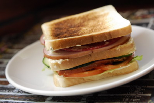 Такой сендвич может запросто заменить сытный завтрак, ведь в его состав входят три тоста, овощи, бекон, колбаса, ветчина и сыр. А соус тартар смягчает вкус хлеба и придает бутерброду особый вкус