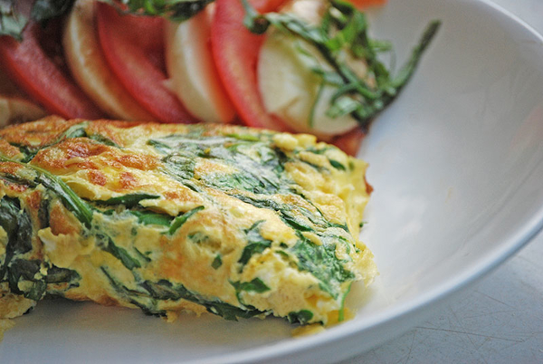 Готовим на завтрак омлет со шпинатом и рукколой с гарниром из томатов и моцареллы