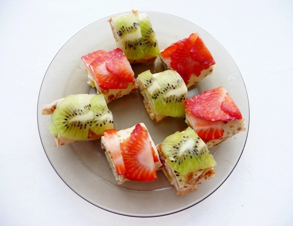 Несколько ванильных сырков взбить со сливками. Подготовить и нарезать фрукты. Если блины небольшого диаметра, разместить 2 блина по всей ширине коврика для суши. Намазать сырковой массой. Выложить нарезанные фрукты. С помощью коврика для суши завернуть ролл. Украсить ломтиками клубники и киви.