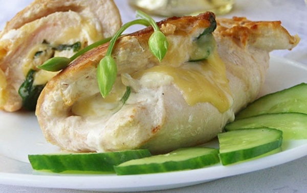 Одну сторону каждого филе смазать йогуртом, выложить тонкий ломтик сыра. Затем по всей длине выложить измельченную зелень, свернуть филе рулетом и обвалять в крахмале или панировочных сухарях.